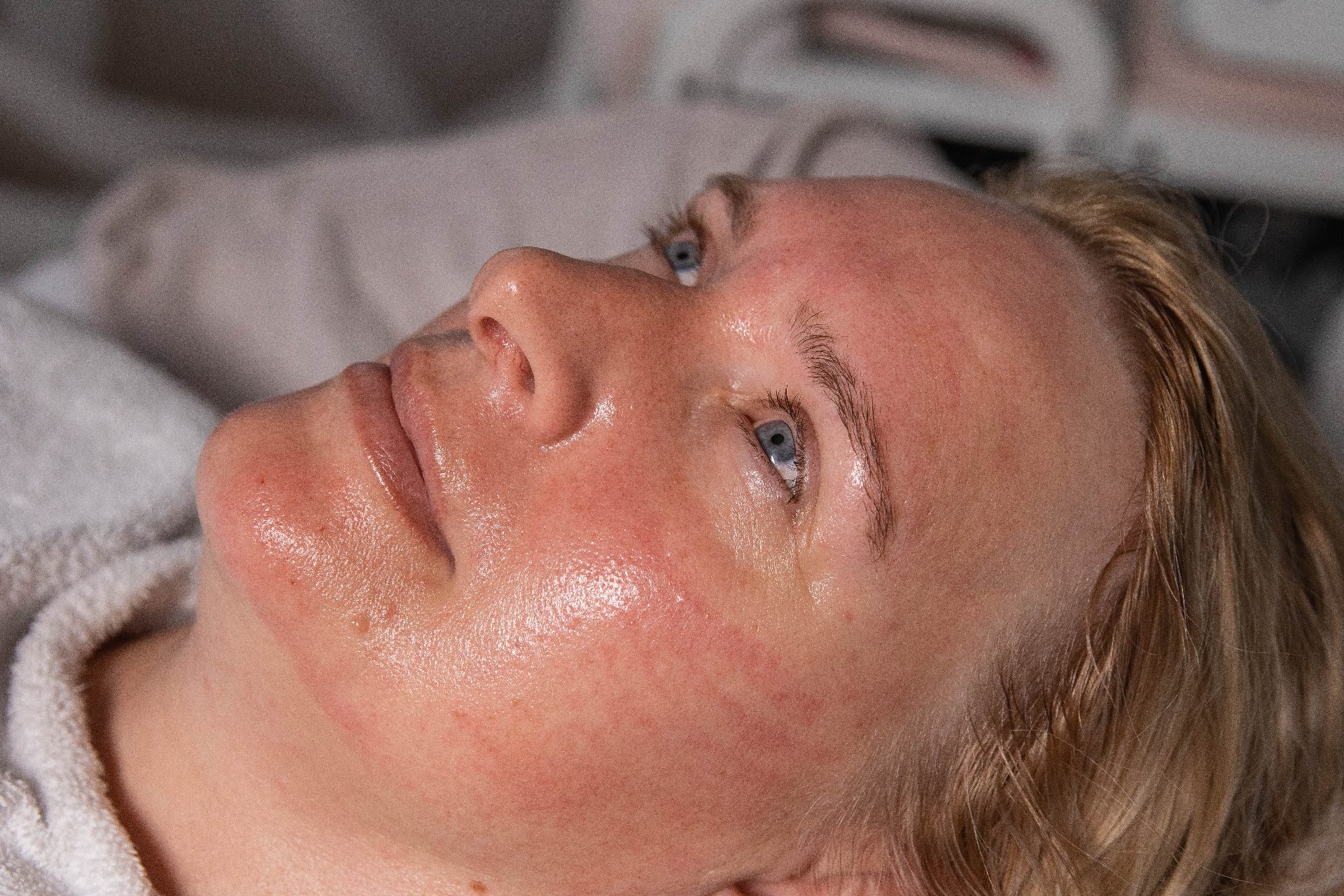Nach dem Needling wird eine kühlende Maske in Kombination mit einer LED-Maske aufgetragen, um die Haut zu beruhigen.